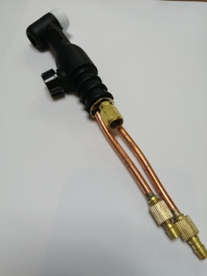 Головка для горелки TIG TP 18 с кнопочным управлением. Может использоваться для комплектации горелок с фиксированной и гибкой головкой. Все элементы головки выполнены из резины первичной выплавки, латунных и медных элементов. Крепление через левую резьбу 3/8 UNF24.